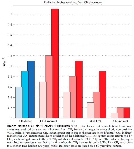 The study by Isaksen et al. calculates that a scenario of 7 times current methane (image below, medium light colors) over 50 years would correspond with a radiative forcing of 3.6 W m⁻².
