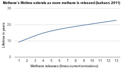 Methane’s lifetime extends as more methane is released, due to hydroxyl depletion, as illustrated by the graph on the right, based on data by Isaksen et al. (2011).