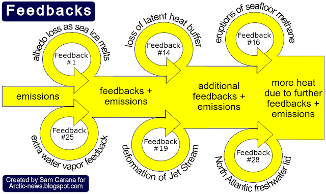 There are further emissions and developments such as tipping points and feedbacks that should be taken into account. The above image, from an earlier post, illustrates the mechanism how multiple feedbacks can accelerate the temperature rise of the atmosphere.