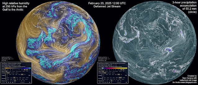 The image below shows a deformed Jet Stream (lines show wind pattern) forecast for February 20, 2025 12:00 UTC, with high relative humidity at 250 hPa (left) and a 3-hour precipitation accumulation of 55.2 mm forecast at the green circle (right).
