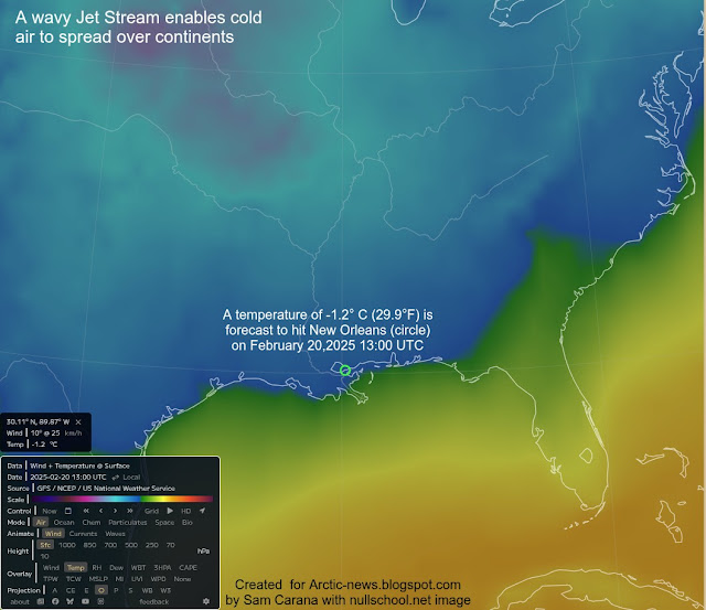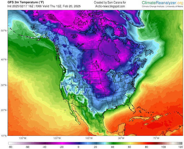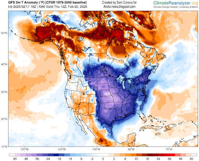 The image below shows temperature anomalies (°F) forecast for February 20, 2025 12:00 UTC over North America.