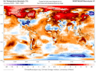 Temperature anomalies were very high in January 2025 in the Arctic, as illustrated by the image on the right.
