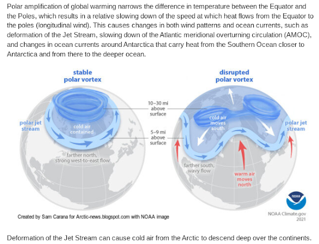 Arctic amplification of global warming at times causes the Jet Stream to become very wavy, enabling cold air from the Arctic to spread over deep over continents (i.e. North America, Asia and Europe).