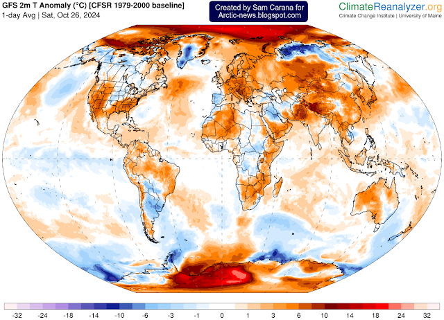 The compilation of images below shows forest fires as the largest source of carbon dioxide emissions on October 26, 2024. An image of carbon monoxide is also added (bottom right), as carbon monoxide is an indicator of forest fires. Carbon monoxide is also important since it is a precursor of tropospheric ozone and carbon monoxide depletes tropospheric hydroxyl radicals, thus extending methane’s lifetime.