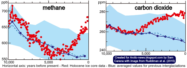 Note that values for methane as low as 550 ppb and carbon dioxide as low as 260 ppm have been found in ice cores corresponding with periods thousands of years ago, as illustrated by the image below, from the pre-industrial page, based on Ruddiman et al. (2015).