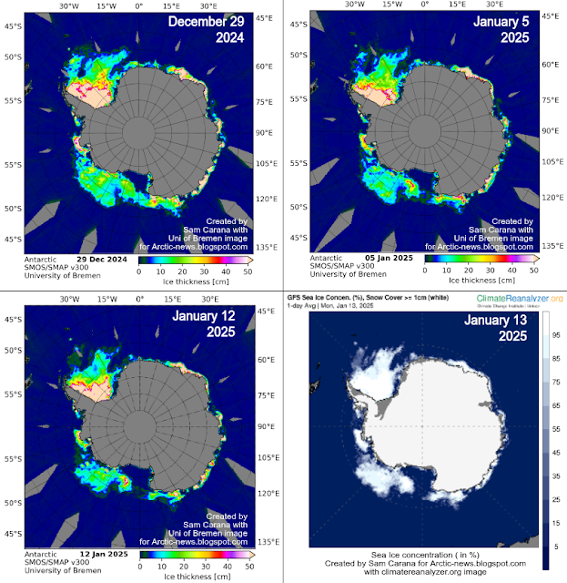 The above images, adapted from University of Bremen and ClimateReanalyzer.org, illustrate the decline in thickness (in cm) and of Antarctic sea ice between August 27, 2024, and January 9, 2025, and the sea ice concentration on January 9, 2025.