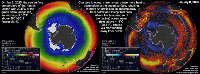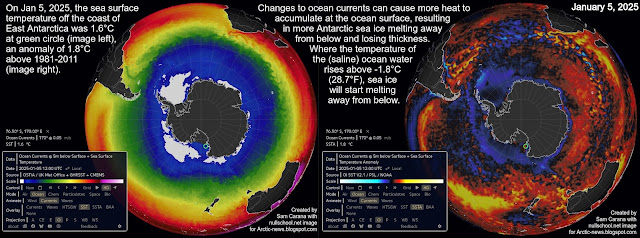The compilation image below shows the Southern Hemisphere on January 5, 2025, when the sea surface temperature off the coast of East Antarctica was 1.6°C at the green circle (image left), an anomaly from 1981-2011 of 1.8°C (image right).
