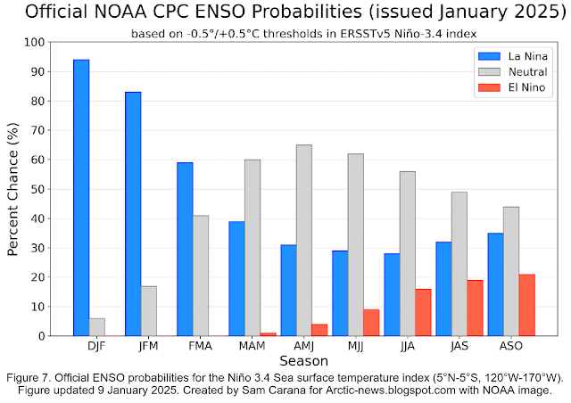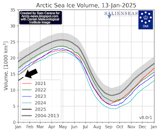 Meanwhile, Arctic sea ice volume remains at a record low for the time of year. The image on the right, from dmi.dk, shows volume through January 13, 2025 (black arrow points at 2025 Arctic sea ice volume).