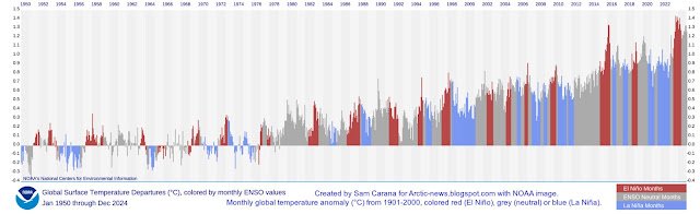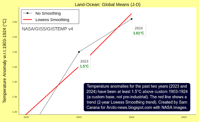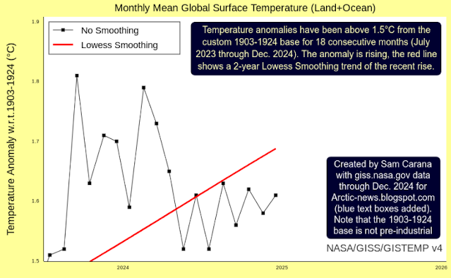 The image below, created with NASA data through December 2024 while using a 1903-1924 custom base, illustrates that the monthly temperature anomalies have been above 1.5°C compared to this base for 18 consecutive months (from July 2023 through December 2024). The red line shows a trend (2-year Lowess Smoothing) associated with recent data and the trend indicates that the anomaly is rising.