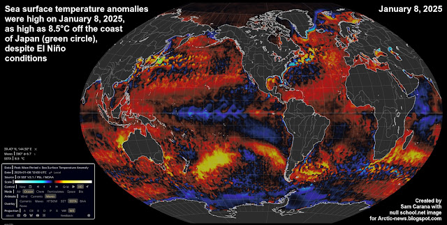 Sea surface temperature anomalies are also very high, as high as 8.5°C off the coast of Japan (at the green circle) on January 8, 2025.