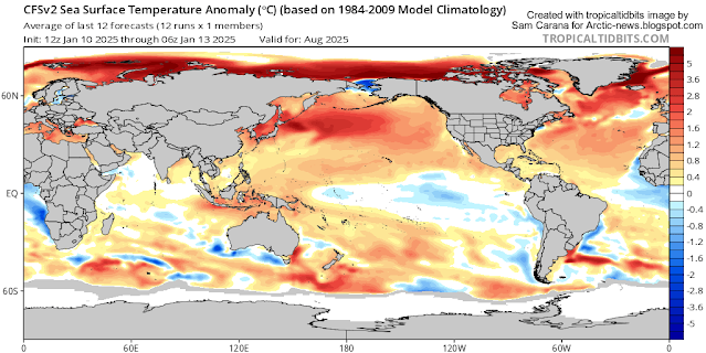 High sea surface temperature anomalies are forecast for the Arctic Ocean for August 2025, as illustrated by the image below, from tropicaltidbits