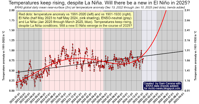 Temperatures are typically suppressed during La Niña. Despite temperatures being suppressed, the global surface air temperature reached 13.23°C on January 10, 2025, the highest temperature on record for the time of year, according to ERA5 data. Temperatures keep rising, as indicated by the trends in the image below. Will a new El Niño emerge in the course of 2025?