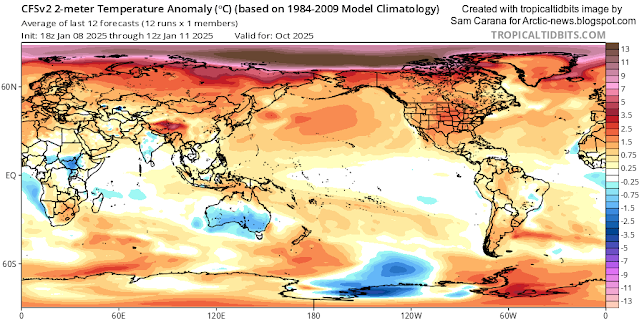 As illustrated by the image below, very high temperature anomalies forecast over the Arctic Ocean for October 2025.