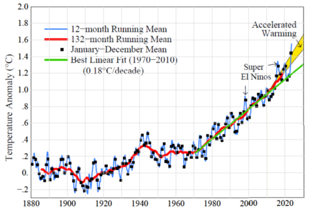 Figure 2. Global temperature relative to 1880-1920 based on the GISS analysis (Hansen et al., 2024).
